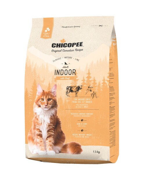 Chicopee Adult Cat Indoor je kompletní a vyvážené krmivo určené výhradně kočkám žijícím v pohodlí bytů a domů. Tyto kočky mají nižší potřebu přísunu energie, a právě pro ně bylo krmení Chicopee Indoor speciálně vyvinuto. U koček chovaných v bytech a domech klesá potřeba lovit kořist a veškerou energii věnuje hrám a pohodlí, které mu tento život skýtá. Je důležité regulovat přísun kalorií, aby Vaše kočka netrpěla nadváhou a dalšími zdravotními problémy, které s tím mohou souviset. Tuto péči a kontrolu Vám Chicopee Indoor nabízí.