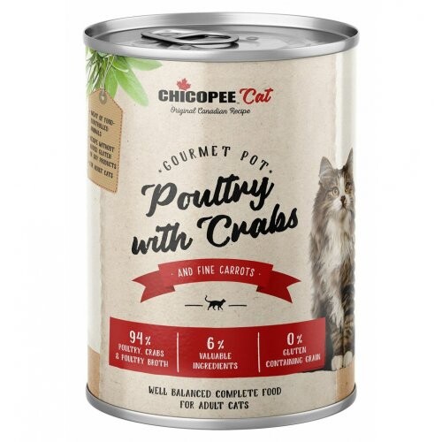 Plnohodnotné krmivo pro dospělé kočky Chicopee Cat Gourmet neobsahuje obiloviny, lepek ani sóju.Poultry & Crabs obsahuje z 94 % maso a jiné živočišné produkty vč. masového vývaru a z 6 % zeleninu a jiné cenné ingredience.
